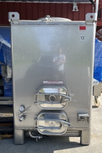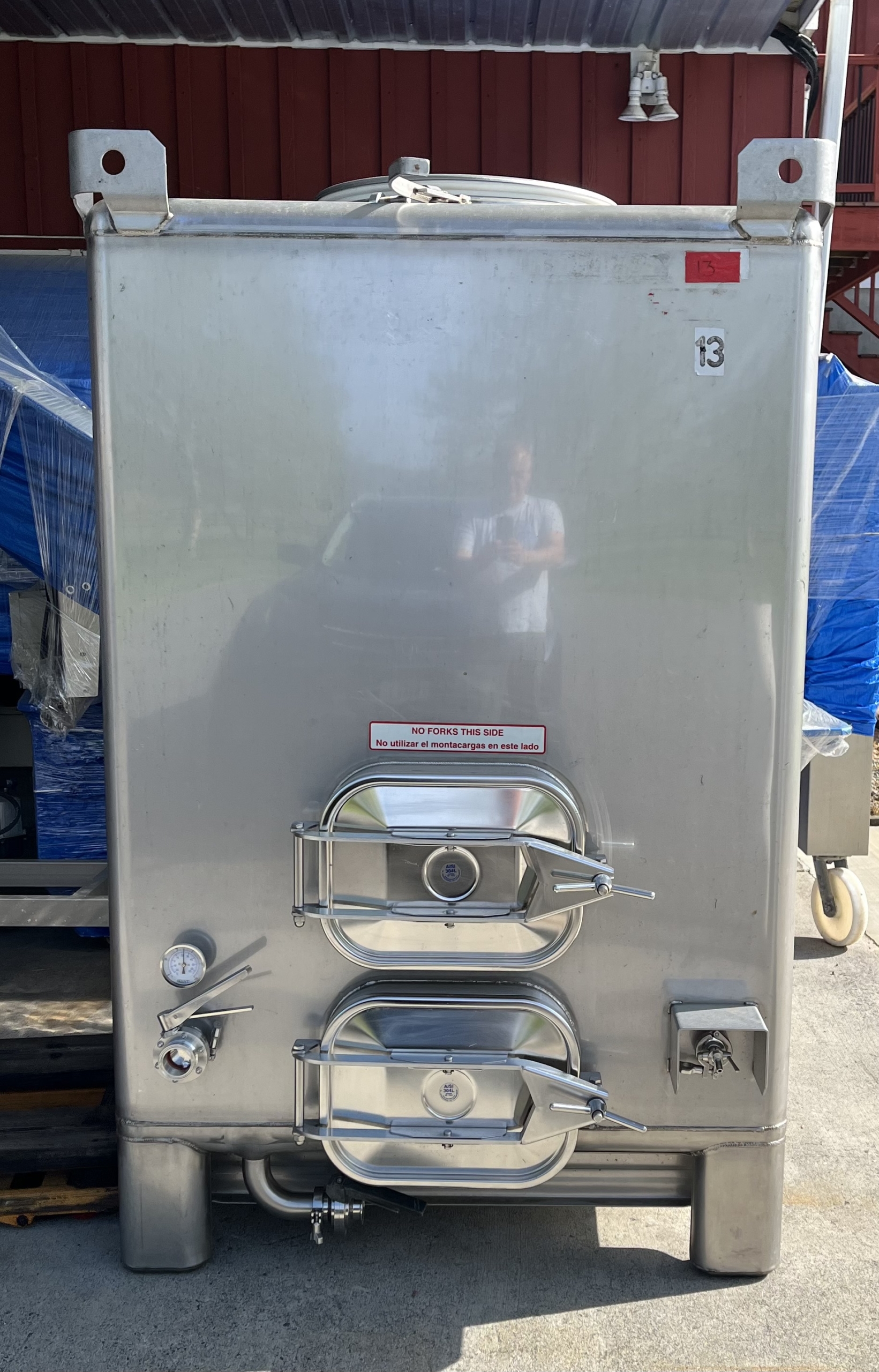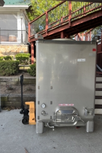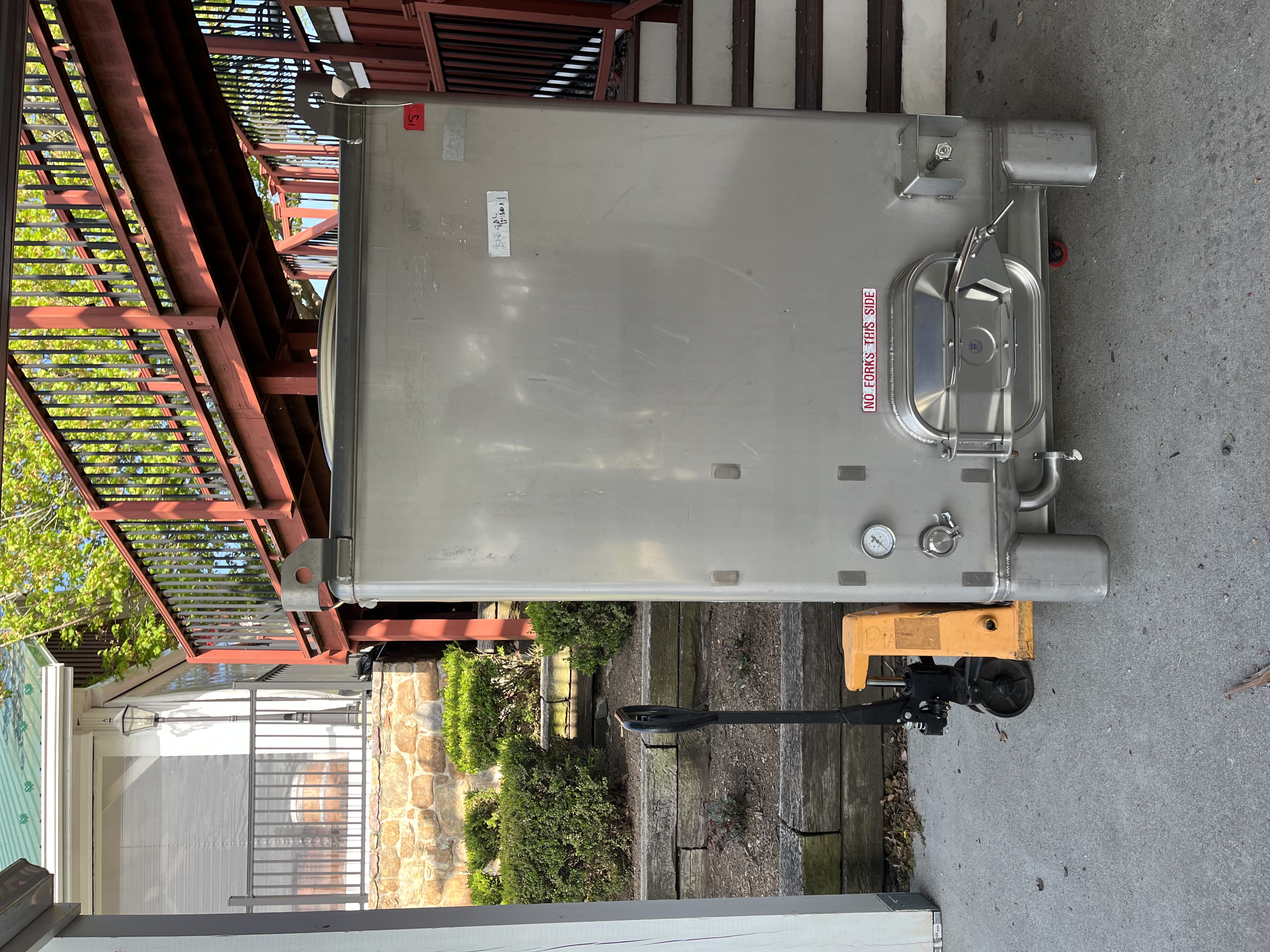 Jacketed with racking valve, bottom valve, sample port, temp port, top man-way door.